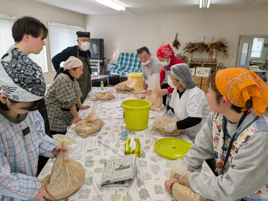天気に恵まれ、味噌の材料である大豆をコネコネしていると、体がポカポカしてきました!